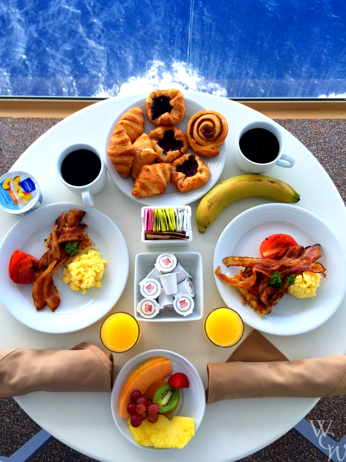 Raňajky sa podávajú v bufetovej reštaurácii a s obsluhou v hlavných reštauráciách. Na požiadanie (a podľa výberu z menu) sa raňajky sa podávajú aj v kajutách, každé ráno s výnimkou dňa, kedy prebieha vylodenie cestujúcich. Táto služba môže byť bezplatná alebo za príplatok, podľa podmienok konkrétnej poločnosti.