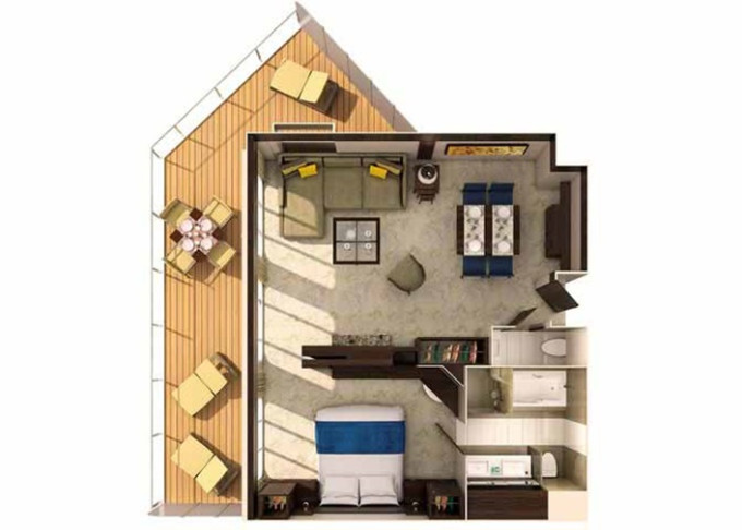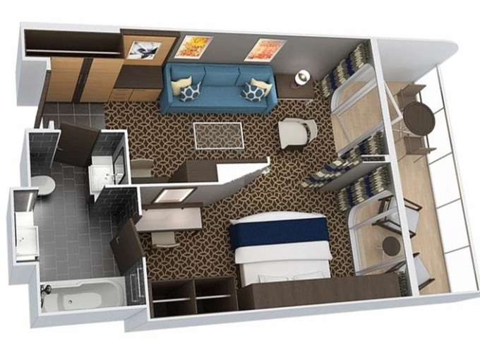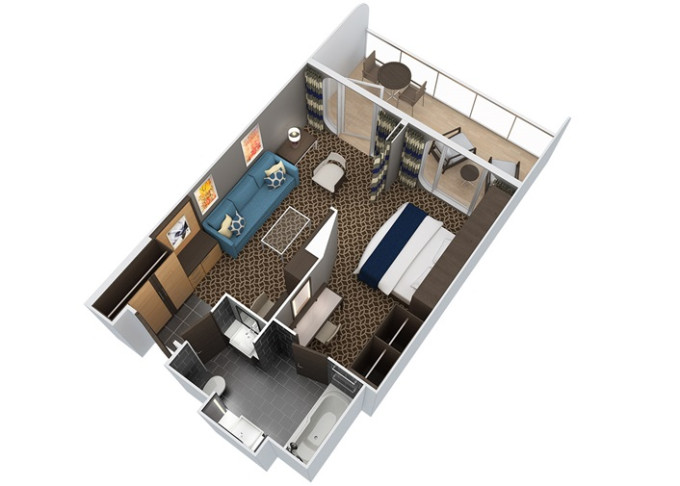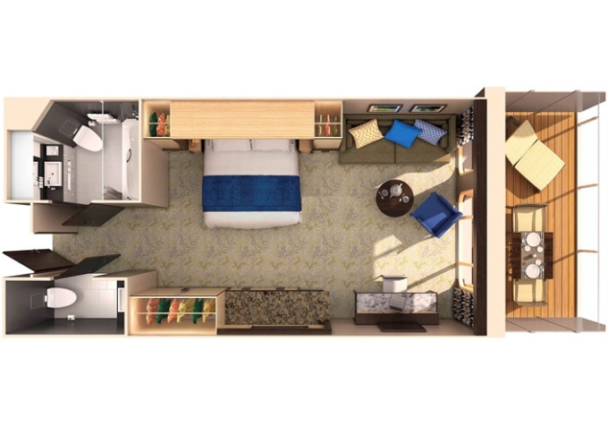 | J1 - Junior Suite s veľkým balkónom 25,5 m² + balkón 15 m². Max 2-4 osoby. Výhody Royal Suite Sea Class. | 1 822 € 911 € za osobu | ||